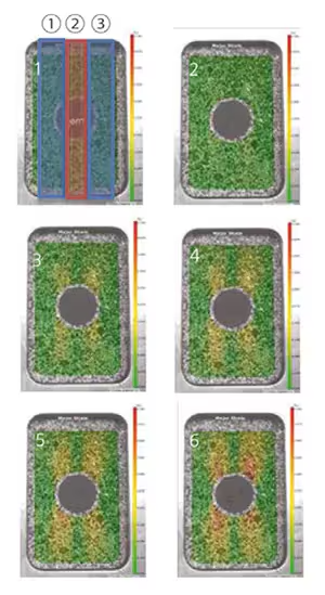 Figure 3 shows DIC strain distributions around the hole in the specimen. Strain accumulated at the vertical sides of the open hole (regions 1 and 3), and strain appeared along the axis of compression from those points. The final break occurred at the vertical sides of the hole.