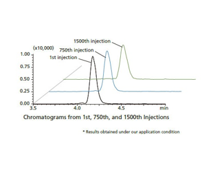 Stable peak forms and retention times are obtained even after 1500 injections of plasma samples with...
